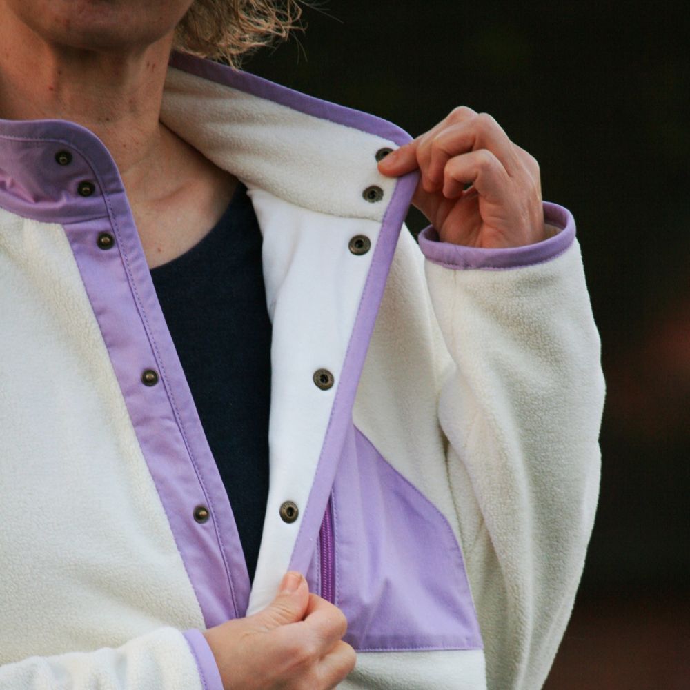 Achte bei der Zusammenstellung des Außen- und Futterstoffes darauf, dass sie ähnlich sind, d.h. wenn der Außenstoff etwas dehnbar ist, sollte Jersey oder French Terry als Futter verwendet werden. So kannst du verhindern, dass sich weder die Außen- noch die Innenjacke über das Schrägband wölbt.