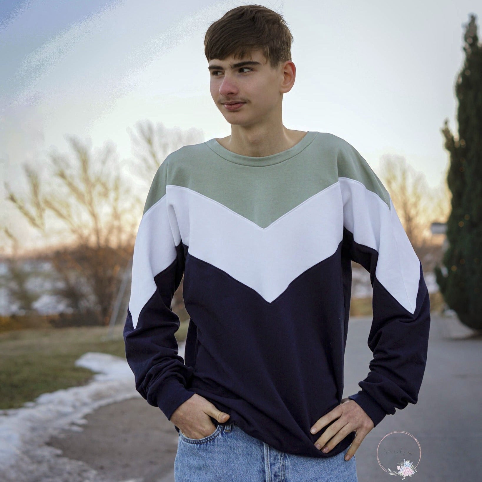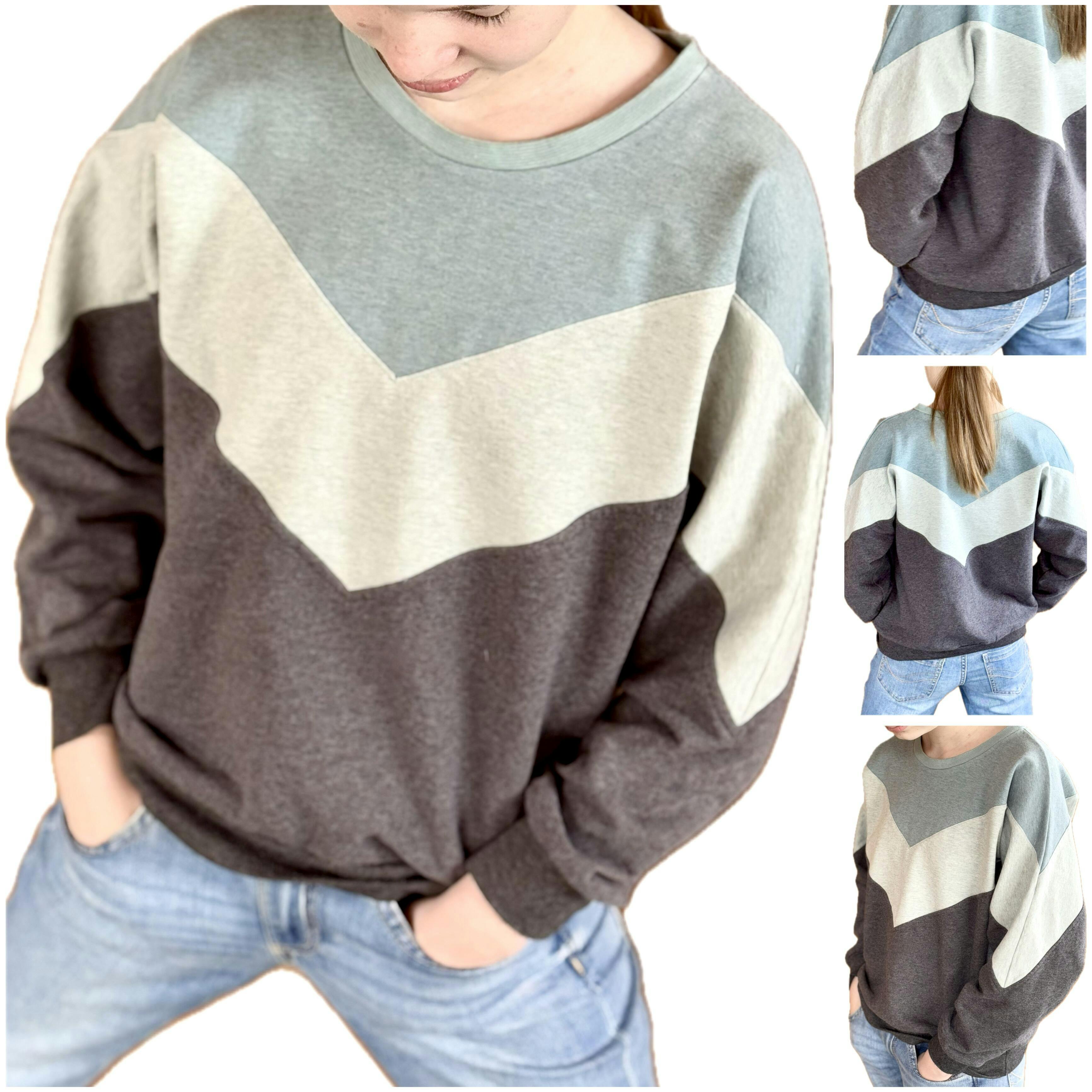 Der lässige Colourblocking-Sweater Neira ist dreiteilig und oversize geschnitten. Er besticht durch seine einzigartige Teilung und eignet sich hervorragend als kuscheliger Begleiter für die kühleren Stunden. Die Ärmel sowie der Bund können wahlweise mit Gummizug im Saum oder mit Bündchen aus Bündchenware genäht werden.