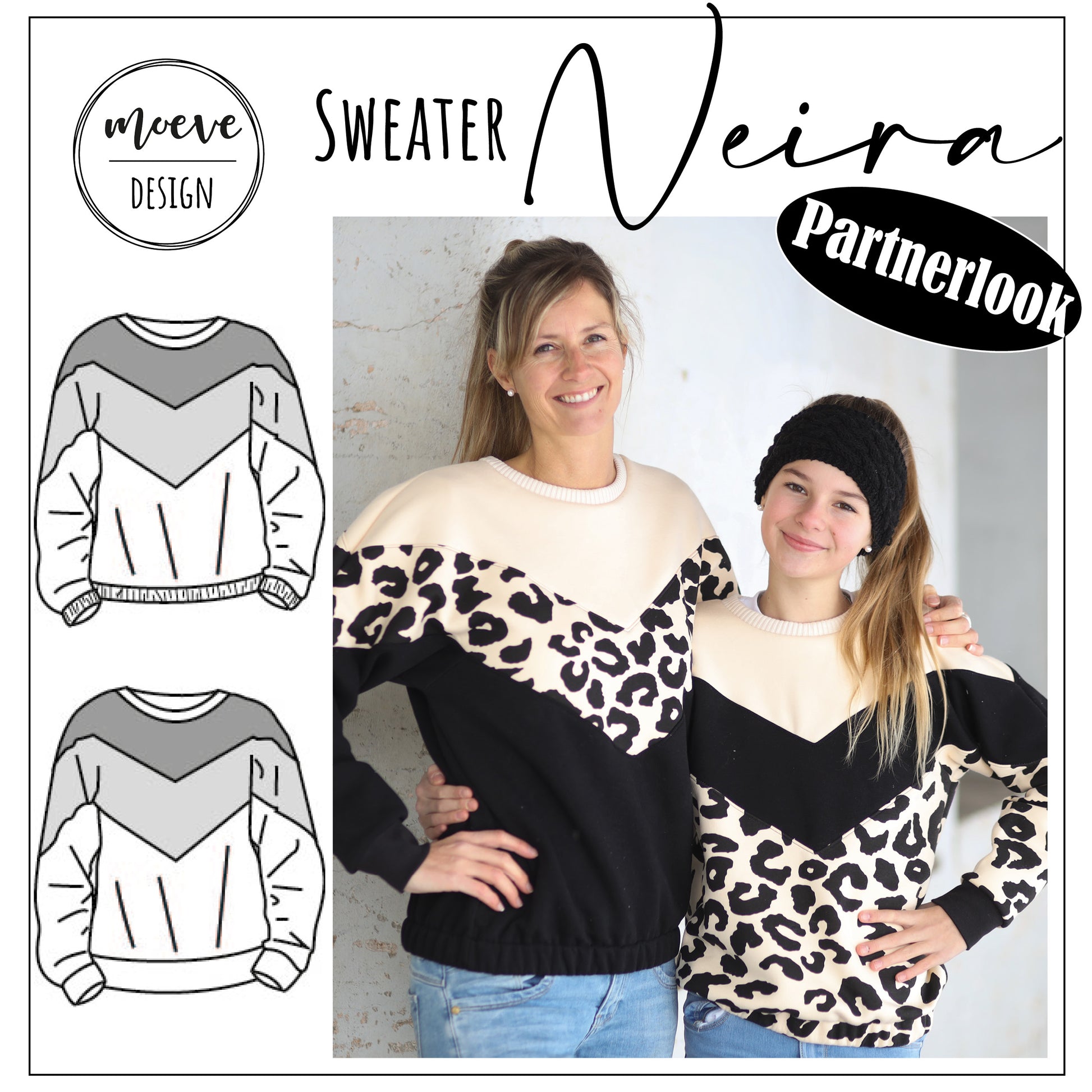 Du erwirbst die beiden E-Books "Sweater Neira Gr. 32-52 und Mini Sweater Neira Gr. 86-176".